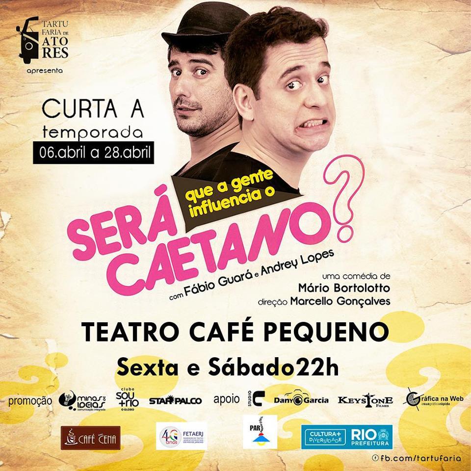 De 6 a 28 de abril, voltamos em cena com a comédia SERÁ QUE A GENTE INFLUENCIA O CAETANO? No teatro Café Pequeno. Após essa temporada, peça dirigida por Marcello Gonçalves segue para a Africa.