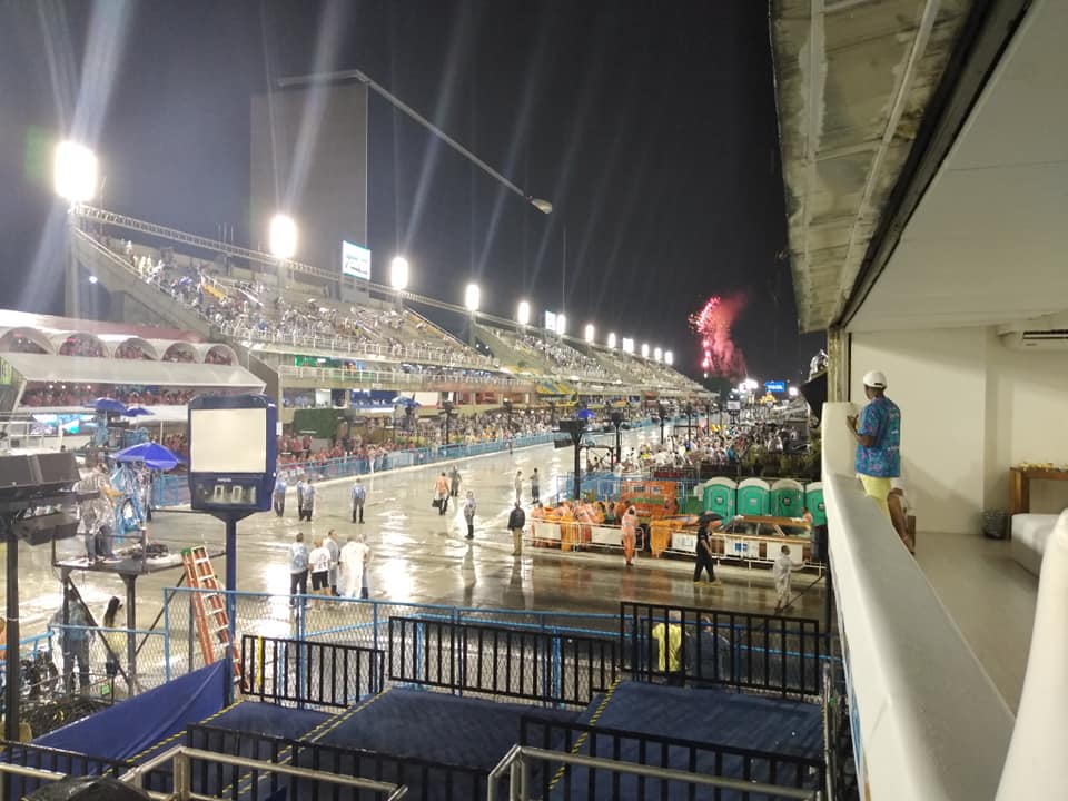 A chuva era forte deixando um pouco vazia a Sapucaí mais nem assim impediu que os foliões que estava ali conseguissem aproveitar os desfiles que por conta do mau tempo atrasaram em 1 hora.