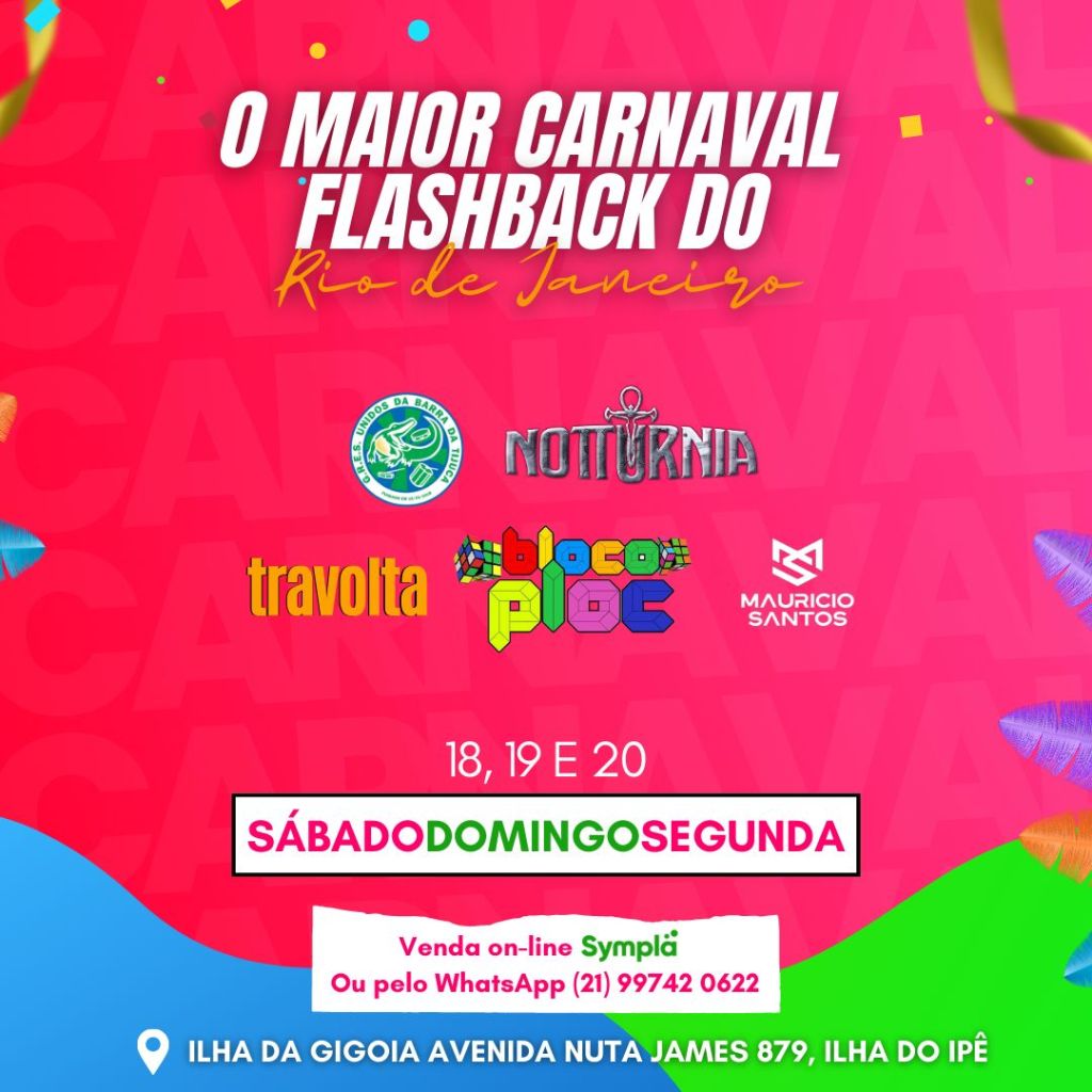 Com uma setlist recheada de sucessos dos anos 80, 90 e depois muito samba. A experiência mais descolada do carnaval promete uma experiência sofisticada de curtir o carnaval neste ano, na ilha do ipê (localizada d na ilha da gigoia), em um casarão enorme, com ambientes cobertos, áreas vip e camarotes Tem ingressos para os dias 18, 19 e 20 – mas não demore a adquirir o seu dia, pois os ingressos já estão se esgotando. As atrações prometidas são: balada flashback, bloco ploc no dia 18. Balada flashback, banda blackman no dia 19 e balada flashback e banda notturnia no dia.