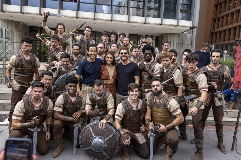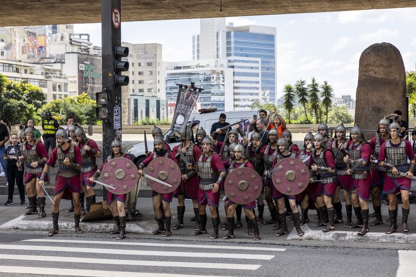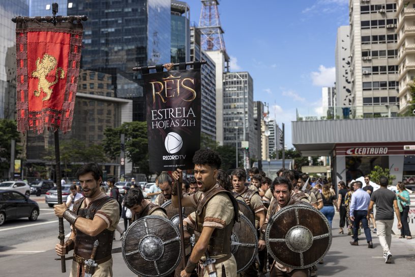 Em pleno começo de tarde no coração de São Paulo, a Avenida Paulista foi invadida por 60 soldados para uma batalha épica. Uma verdadeira cena de Reis, que estreia hoje, às 21 horas, na Record TV. A ação, que despertou os olhares de muitos curiosos, foi uma iniciativa da emissora para divulgar a sexta temporada da série e contou com a participação de atores da trama