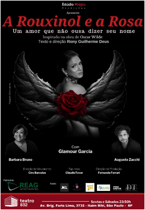 “A Rouxinol e a Rosa – Um amor que não ousa dizer seu nome” é um projeto teatral que promove, através da arte, a reflexão sobre o preconceito, a importância da liberdade de expressão e o direito a igualdade para a comunidade LGBTQIA+. Escrito e dirigido por Rony Guilherme Deusoespetáculo é inspirado em conto do escritor, poeta e dramaturgo Oscar Wilde (Irlanda 1854 – Paris 1900), símbolo da luta pelos direitos homossexuais.No elenco estão Bárbara Bruno, Augusto Zacchie Glamour Garcia, primeira artista Trans a vencer um prêmio revelação por sua atuação.