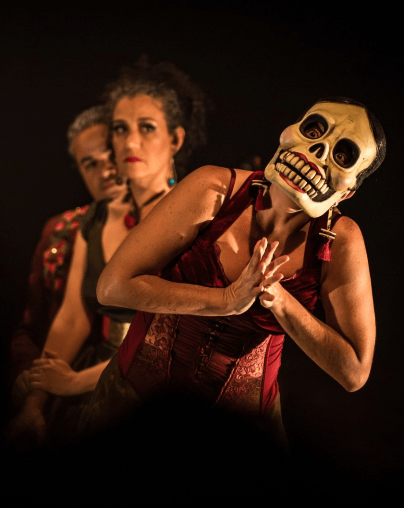 O espetáculo foi inspirado na cerimônia para agradecer o destino dos seres humanos vivos e cumprir os tratos com a misteriosa Catrina, a “Dona Morte”, em uma proposta que tem um diálogo direto com a plateia, regada por músicas entoadas ao vivo. A protagonista nos conduz a histórias mescladas com canções mexicanas conhecidas, como “La Llorona”, “La Bruja” e “Cucurrucucu Paloma”, entre outras, todas entoadas pela uruguaia Natalia Sarante (vencedora de Melhor Música com a peça Canções para afastar o medo – contos e acalantos latino-americanos no Prêmio de Teatro Para Infância CBTIJ/2022) acompanhada pelo violão de Luciano Câmara. A máscara de “Catrina” (Dona Morte), utilizada pela personagem principal, foi confeccionada especialmente no Peru pelo artista Paul Colinó Vargas.