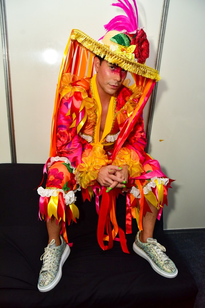 Christian passou no último carro da Grande Rio, que fez uma homenagem vibrante às riquezas culturais da região amazônica. O figurino do artista foi um espetáculo à parte, com uma rosa na cabeça e várias ao redor, adornadas com tecidos florais. As cores intensas como rosa, vermelho, laranja, amarelo e verde estavam presentes tanto nas fitas de cetim quanto nos demais acessórios, criando um visual vibrante e cheio de vida, o look assinado por Ferrulla Muniz e Bruno César, remeteu à exuberância natural do Pará. Com um toque mais teatral, o look do cantor completou a grandiosidade do desfile, marcando sua presença de forma marcante e imponente.