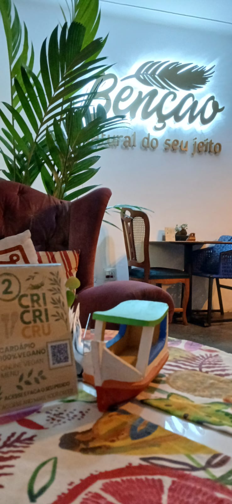 Mas o Cri Cri Cru vai além da cozinha. A proposta é criar um ambiente acolhedor, leve e inspirador, onde cada detalhe foi pensado para você se sentir em casa: poltronas confortáveis, pedras de rio no chão, cristais, livros, instrumentos sonoros e aquela vontade genuína de receber bem.