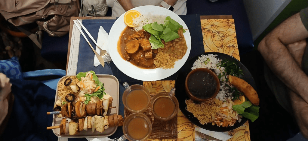 Aqui, o cardápio vegano tem sotaques do Brasil inteiro – e até de fora. Da feijoada ao vatapá, passando por strogonoff, lasanha, tacacá, fricassê, coxinha e muito mais, cada prato tem um nome criativo e um sabor marcante. Todos são elaborados com ingredientes 100% vegetais, sem perder o tempero das receitas clássicas que marcaram a infância de muitos.